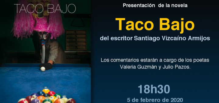 Este miércoles 5 de febrero de 2020 a las 18h30, en el auditorio de la Academia Ecuatoriana de la Lengua, se presenta la novela Taco bajo, del escritor Santiago Vizcaíno Armijos. Los comentarios estarán a cargo de los poetas Valeria Guzmán y Julio Pazos.