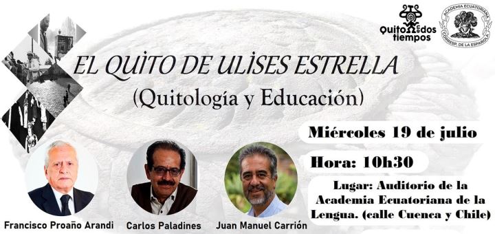 La Academia Ecuatoriana de la Lengua y el Colectivo Quito en dos tiempos invitan a la ciudadanía a la tertulia «El Quito de Ulises Estrella (quitología y educación)», el miércoles 19 de junio a las 10h30 en el auditorio de la Academia.