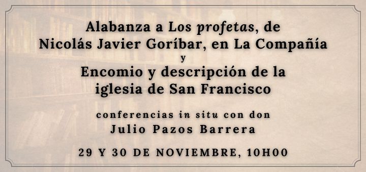 La Academia Ecuatoriana de la Lengua invita a las conferencias ‘in situ’ «Alabanza a ‘Los profetas’, de Goríbar, en La Compañía» y «Encomio y descripción de la iglesia de San Francisco», los días 29 y 30 de noviembre a las 10h00.