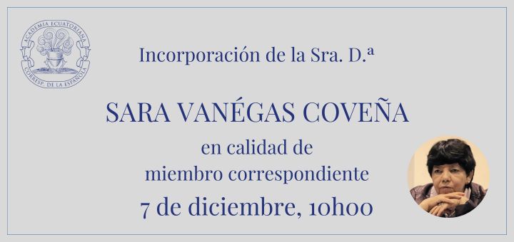 La Academia Ecuatoriana de la Lengua invita a la sesión solemne en la que se incorporará en calidad de miembro correspondiente doña Sara Vanégas Coveña. Le dará la bienvenida doña María Augusta Vintimilla.