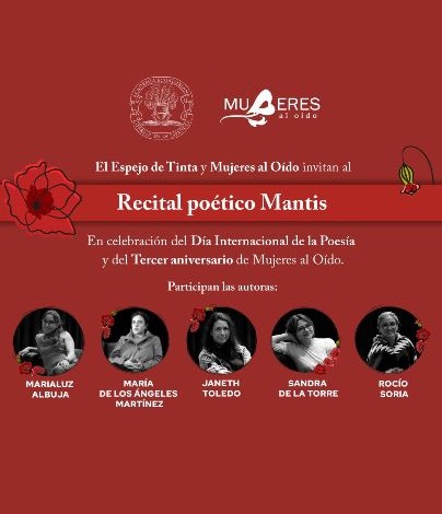 La Academia Ecuatoriana de la Lengua y Mujeres al Oído se complacen en invitar al recital poético Mantis, dentro del espacio en vivo “El espejo de tinta”, en celebración del Día Internacional de la Poesía y del tercer aniversario de Mujeres al Oído. Miércoles 27 de marzo, 17h00.