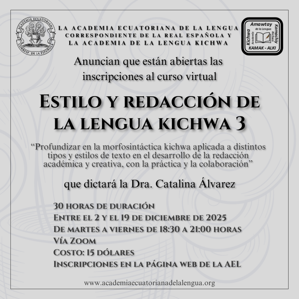 La Academia Ecuatoriana de la Lengua y Academia de la Lengua Kichwa Kamak Alki, anuncian que están abiertas las inscripciones para la tercera parte de curso «Estilo y redacción de lengua kichwa», orientado a personas quichuahablantes.