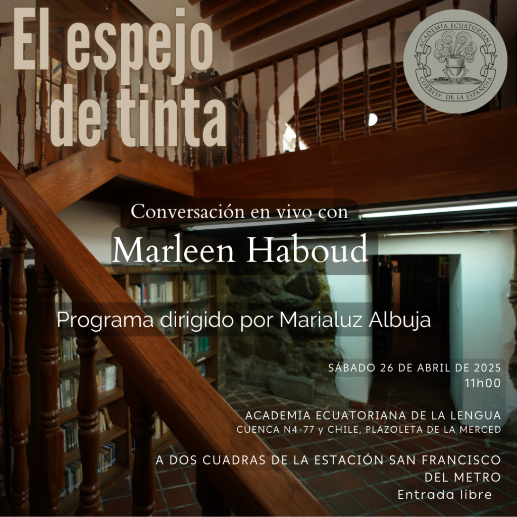 La Academia Ecuatoriana de la Lengua invita a sus amigos a «El espejo de tinta», conversatorio presencial en el que Marialuz Albuja dialogará con nuestra académica Marleen Haboud en el marco del sesquicentenario de la AEL. El programa tendrá lugar, en modalidad presencial, el día sábado 26 de abril a las 11 am en el auditorio de la corporación y, como siempre, será gratuito.