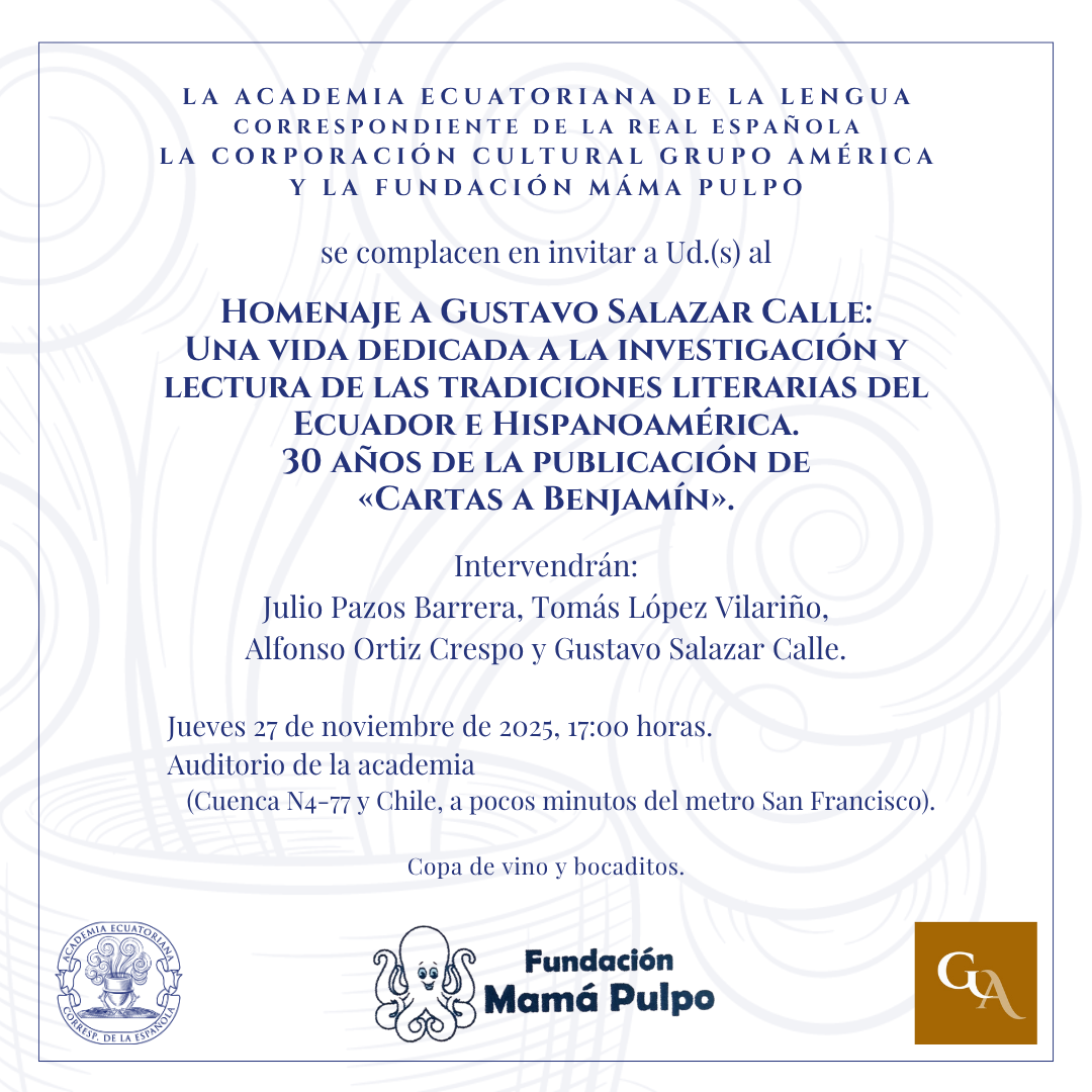 La Academia Ecuatoriana de la Lengua, la Corporación Cultural Grupo América y Fundación Mamá Pulpo invitan al homenaje a don Gustavo Salazar por su trabajo de investigación, a 30 años de la publicación de «Cartas a Benjamín». Jueves 27 de noviembre, 17:00 horas.