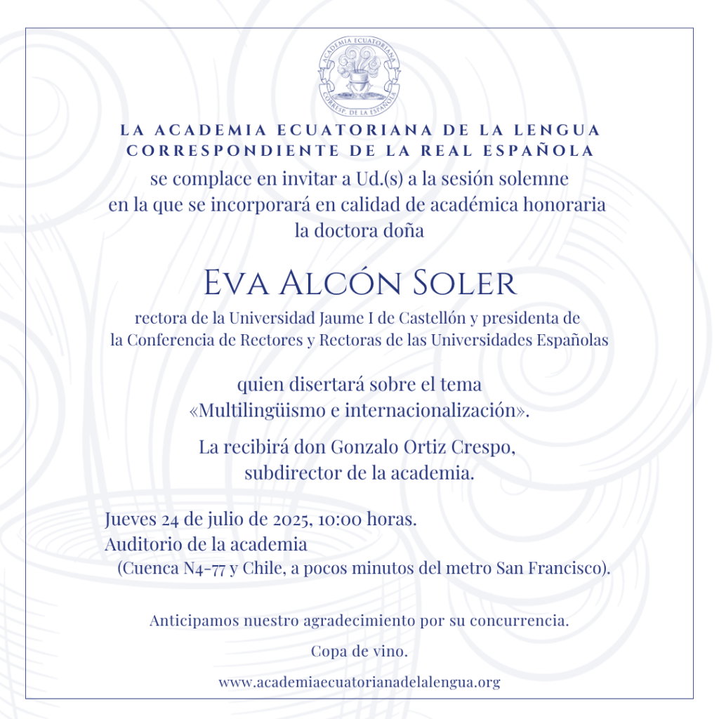 La Academia Ecuatoriana de la Lengua se complace en invitar a Ud.(s) a la sesión solemne en la que se incorporará en calidad de académica honoraria doña Eva Alcón Soler, rectora de la Universidad Jaume I de Castellón y presidenta de la Conferencia de Rectores y Rectoras de las Universidades Españolas, quien disertará sobre el tema «Multilingüismo e internacionalización». La recibirá don Gonzalo Ortiz Crespo, subdirector de la corporación.