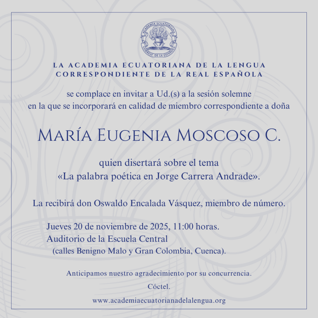 La Academia Ecuatoriana de la Lengua se complace en invitar a Ud.(s) a la sesión solemne en la que se incorporará en calidad de miembro correspondiente doña María Eugenia Moscoso C., quien disertará sobre el tema «La palabra poética en Jorge Carrera Andrade». La recibirá don Oswaldo Encalada Vásquez, miembro de número.