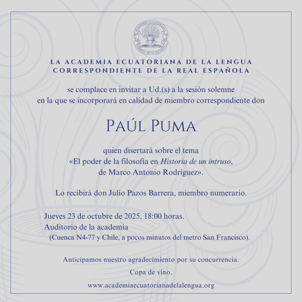 La Academia Ecuatoriana de la Lengua se complace en invitar a Ud.(s) a la sesión solemne en la que se incorporará en calidad de miembro correspondiente don Paúl Puma, quien disertará sobre el tema «El poder de la filosofía en Historia de un intruso, de Marco Antonio Rodríguez». Lo recibirá, en nombre de la institución, don Julio Pazos Barrera, miembro de número.