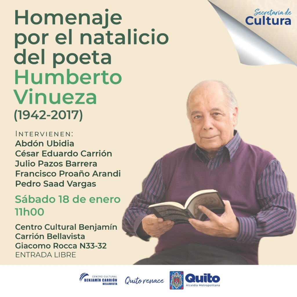 Al conmemorarse el natalicio del poeta Humberto Vinueza se realizará un homenaje en el que participarán don Francisco Proaño Arandi y don Julio Pazos Barrera. Sábado 18 de enero a las 11:00 horas en el Centro Cultural Benjamín Carrión de Bellavista.