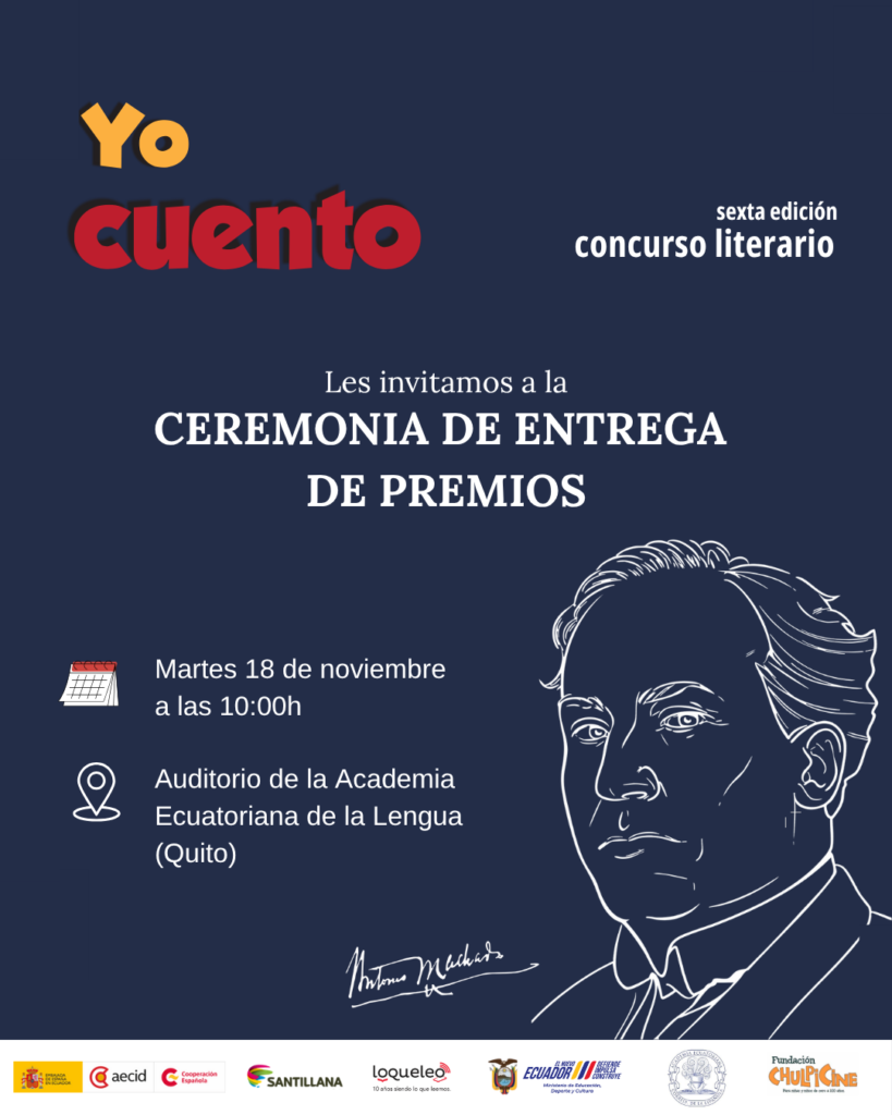 La Embajada de España en el Ecuador, el sello Loqueleo del Grupo Santillana, el Ministerio de Educación, Deporte y Cultura del Ecuador, Fundación Chulpicine y la Academia Ecuatoriana de la Lengua invitan a la entrega de premios del concurso de literatura infantil y juvenil «Yo cuento». Para esta sexta edición los participantes enviaron poemas basados en la figura o la obra de Antonio Machado, al cumplirse los 150 años de su nacimiento.