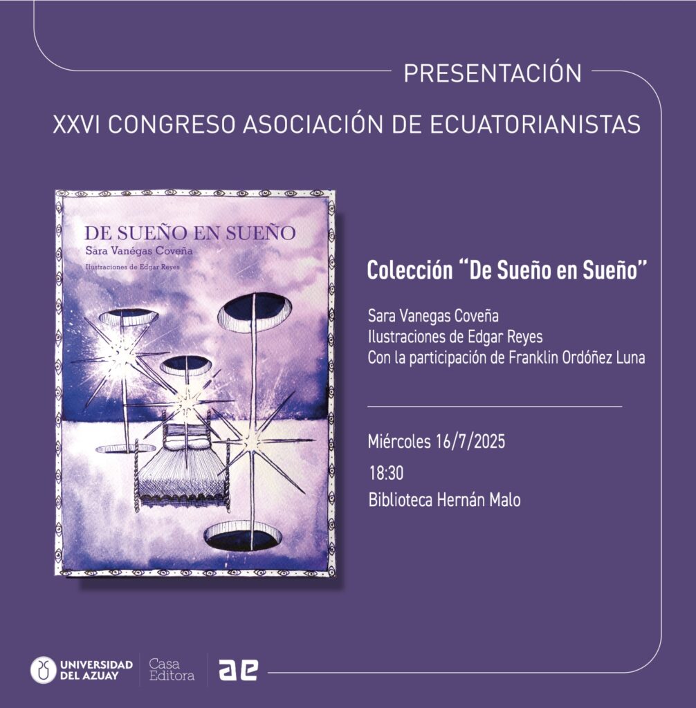 La Academia Ecuatoriana de la Lengua, la Universidad del Azuay y la Asociación de Ecuatorianistas invitan a la presentación de la colección De sueño en sueño, de doña Sara Vanégas Coveña, miembro correspondiente de la corporación, con ilustraciones de don Edgar Reyes. Participará en el acto don Fránklin Ordóñez Luna.