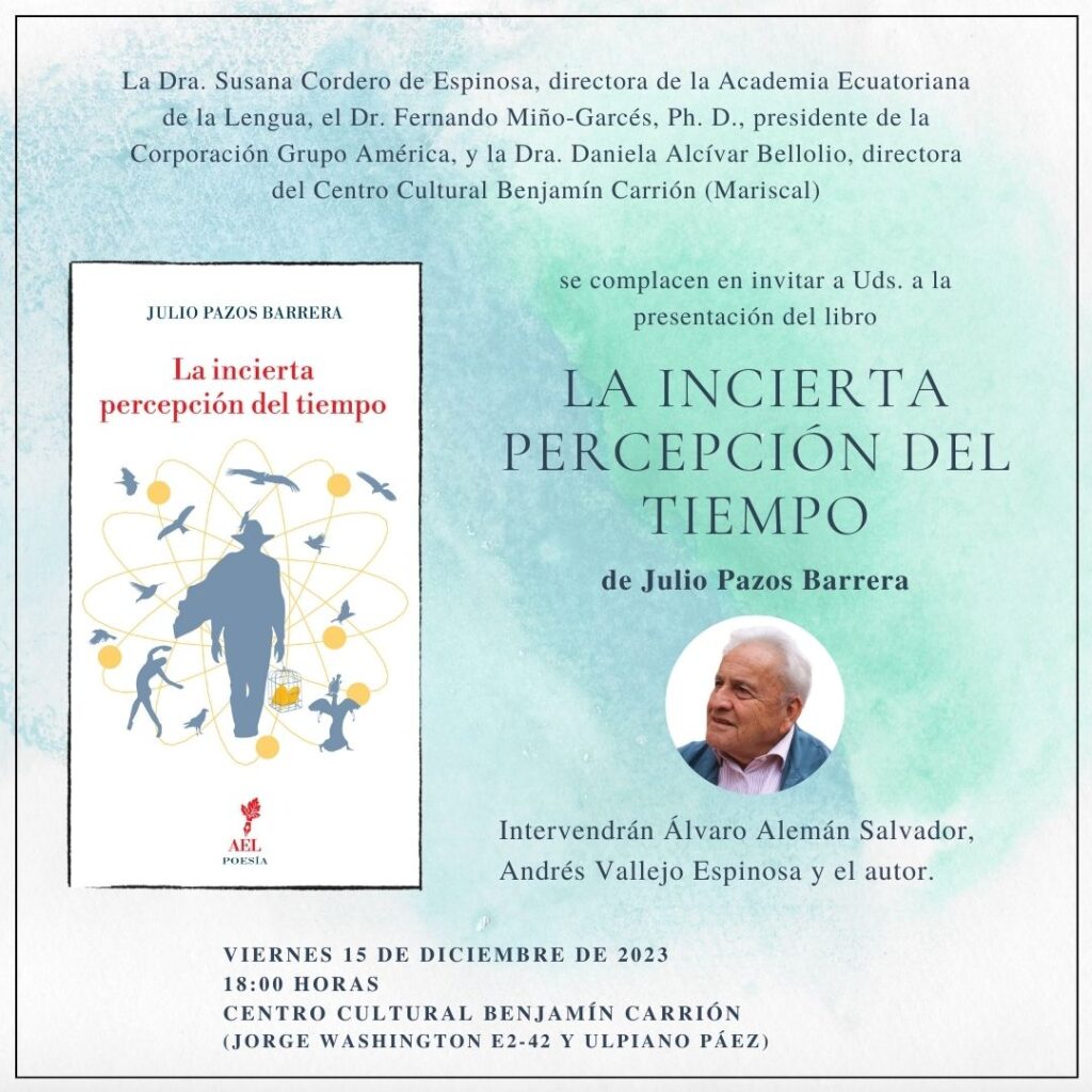La doctora Susana Cordero de Espinosa, directora de la Academia Ecuatoriana de la Lengua, el doctor Fernando Miño-Garcés, Ph. D., presidente de la Corporación Grupo América, y la doctora Daniela Alcívar Bellolio, directora del Centro Cultural Benjamín Carrión (Mariscal), se complacen en invitar a ustedes a la presentación del libro La incierta percepción del tiempo, obra de don Julio Pazos Barrera, miembro de número de la corporación.