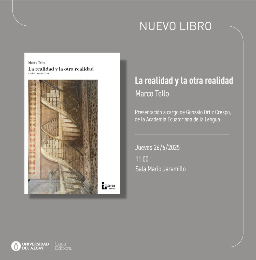 La Academia Ecuatoriana de la Lengua y la Universidad del Azuay invitan al lanzamiento de La realidad y la otra realidad, libro de microensayos de don Marco Tello Espinoza, miembro correspondiente de la corporación, publicado por la Casa Editora de la mencionada universidad. La presentación estará a cargo de don Gonzalo Ortiz Crespo, miembro numerario y subdirector de la academia.
