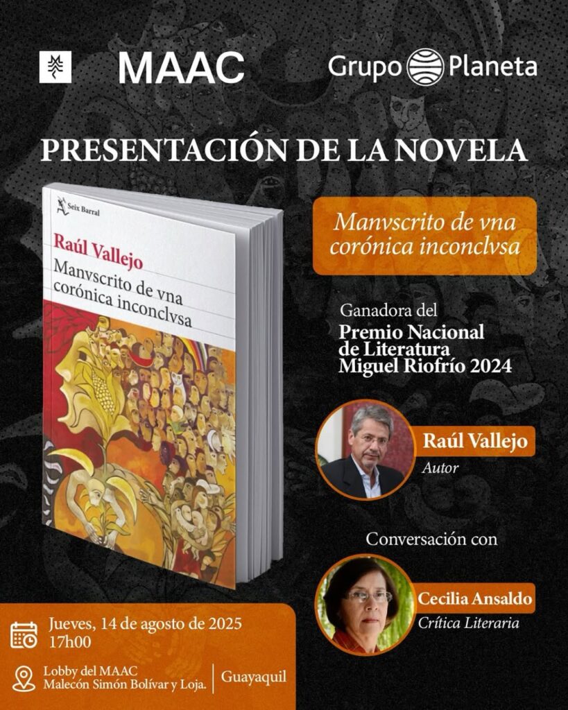 La Academia Ecuatoriana de la Lengua invita a la presentación en Guayaquil de «Manvscrito de vna corónica inconclvsa», de don Raúl Vallejo, el jueves 14 de agosto de 2025 a las 17:00 horas en el vestíbulo del MAAC.