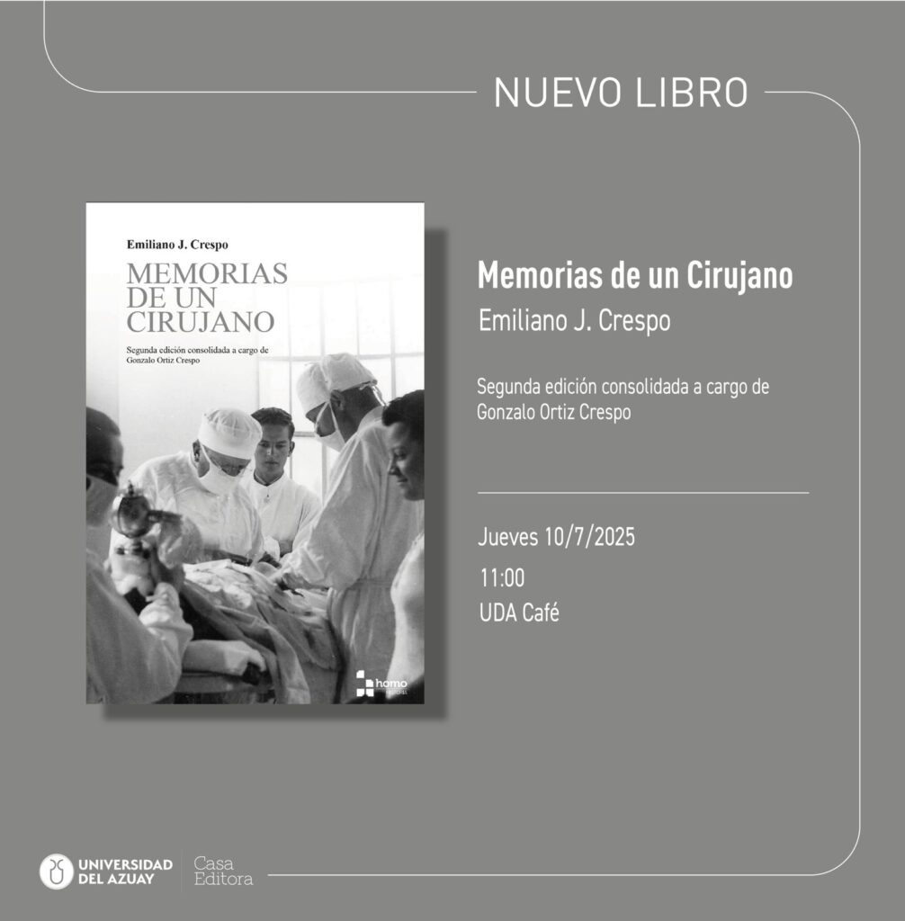 La Academia Ecuatoriana de la Lengua y la Universidad del Azuay invitan a la presentación del libro Memorias de un cirujano, de Emiliano J. Crespo, el jueves 10 de julio de 2025 a las 11:00 horas en el UDA Café. Esta es la segunda edición consolidada de la obra, que estuvo a cargo de don Gonzalo Ortiz Crespo, subdirector de la corporación, y que publicó la Casa Editora de la universidad.