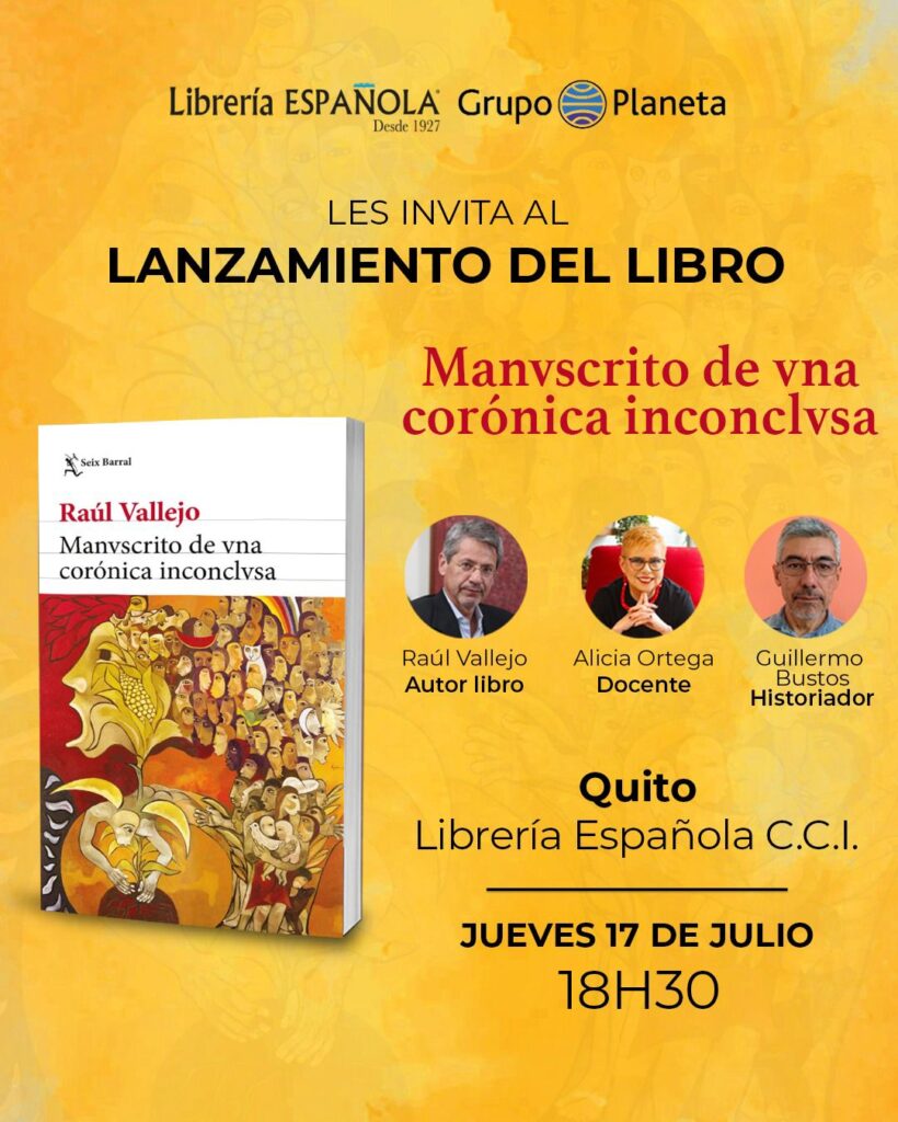 La Academia Ecuatoriana de la Lengua y Librería Española invitan a la presentación del libro Manvscrito de vna corónica inconclvsa, de don Raúl Vallejo Corral, miembro numerario de la corporación, que se llevará a cabo en la Librería Española del Centro Comercial Iñaquito de la capital, el jueves 17 de julio de 2025 a las 18:30 horas. Intervendrán en la presentación doña Alicia Ortega, don Guillermo Bustos y el autor.