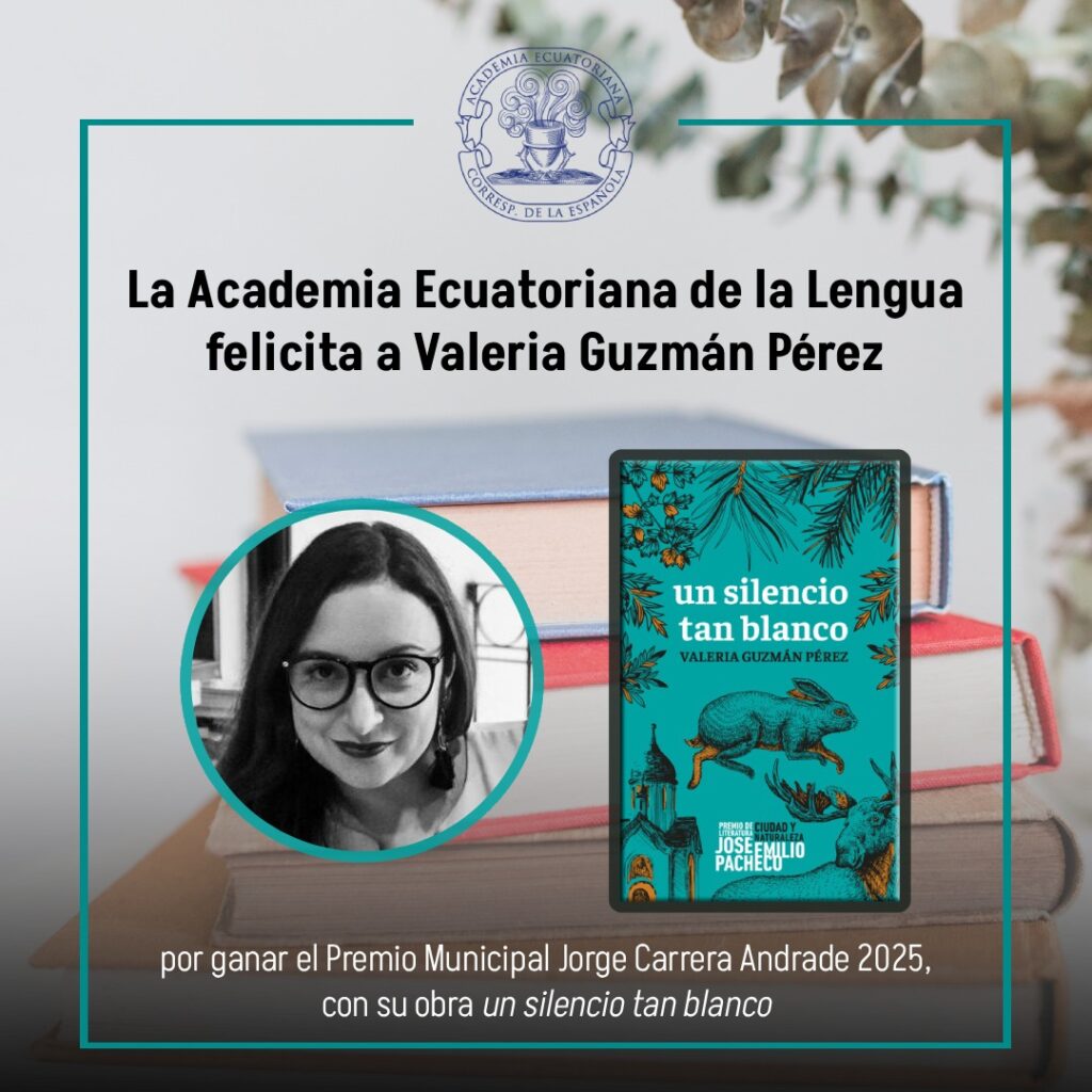La Academia Ecuatoriana de la Lengua, correspondiente de la Real Española, felicita a doña Valeria Guzmán Pérez, lexicógrafa de la corporación, quien con su poemario Un silencio tan blanco ganó el Premio Jorge Carrera Andrade a la mejor obra publicada en poesía en 2025, parte de los premios artísticos y culturales que otorga el Municipio de Quito.