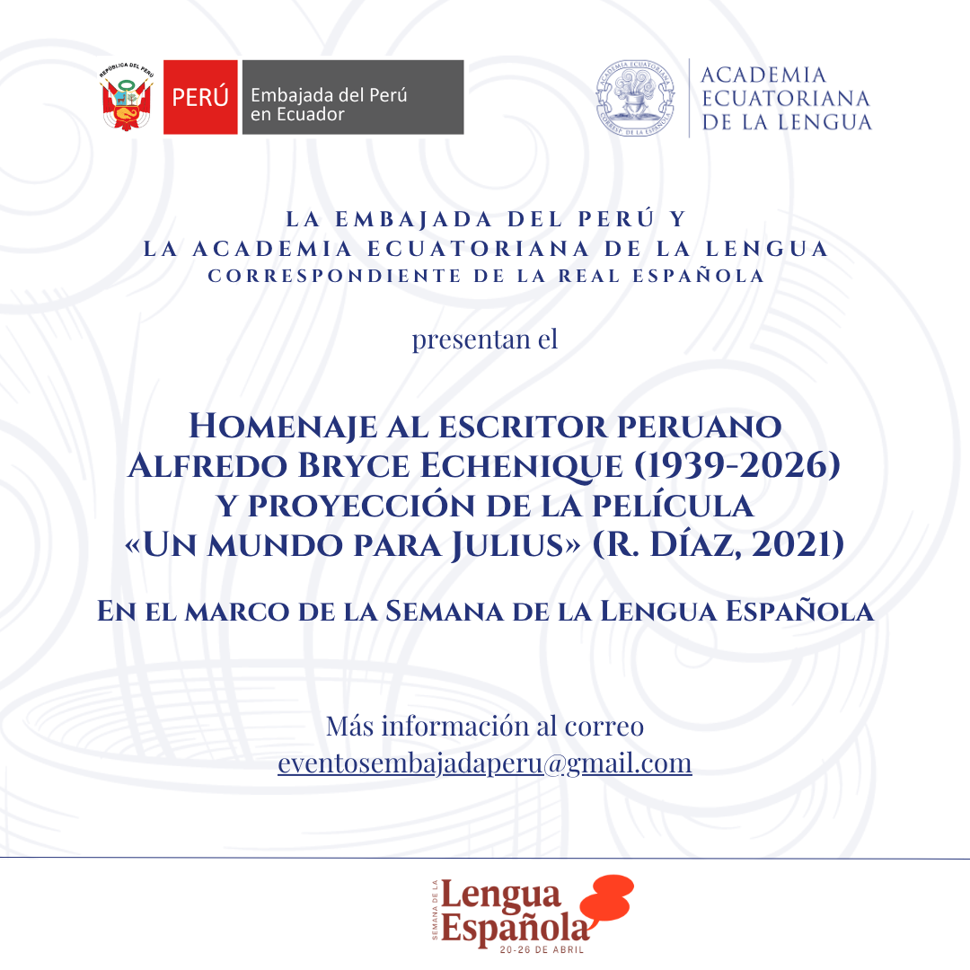 La Embajada del Perú, con los auspicios de la Academia Ecuatoriana de la Lengua, proyectará la película Un mundo para Julius, de la directora Rossana Díaz Costa. Este filme está inspirado en la novela homónima de Alfredo Bryce Echenique, una de las glorias de la literatura peruana, fallecido el pasado 10 de marzo. Al finalizar se efectuará un conversatorio en el que participarán el señor embajador del Perú, don Eduardo Zeballos Valle, y don Francisco Proaño Arandi, director de la academia.