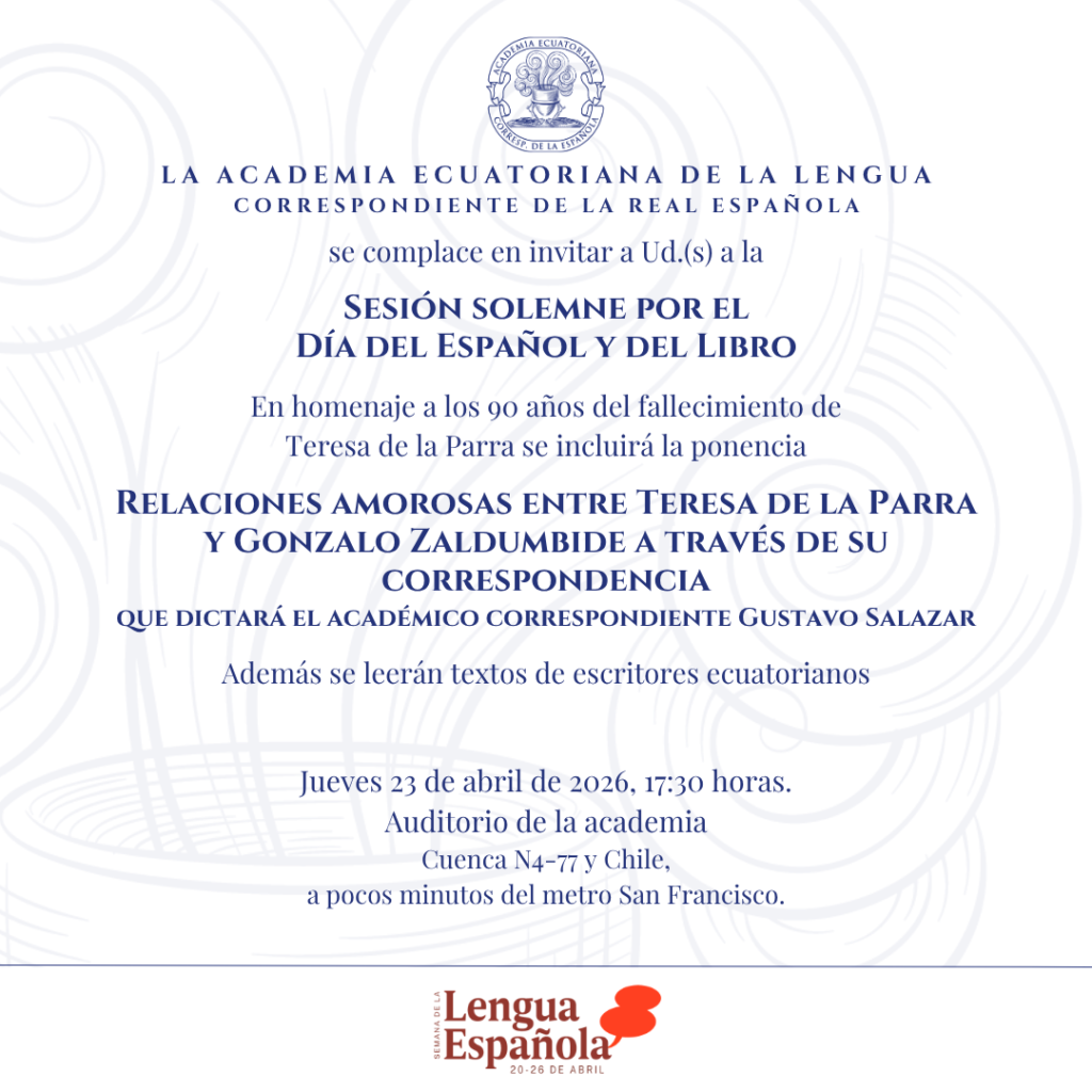 Como cierre de las actividades en nuestra sede se llevará a cabo una sesión solemne por el Día del Español y del Libro, en la que se leerán textos de escritores ecuatorianos. Además, en homenaje a los 90 años del fallecimiento de Teresa de la Parra, se incluirá la ponencia «Relaciones amorosas entre Teresa de la Parra y Gonzalo Zaldumbide a través de su correspondencia», que dictará el académico correspondiente don Gustavo Salazar Calle.